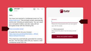 So öffnen Sie eine passwortgeschützte E-Mail, die von Tuta Mail gesendet wurde: Klicken Sie auf den Link und geben Sie das Passwort ein.