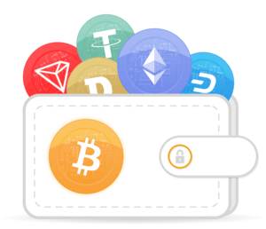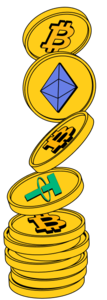 Three gold coin flowers feature Bitcoin, Ethereum, and Litecoin symbols. Visit Coinmama to buy crypto.